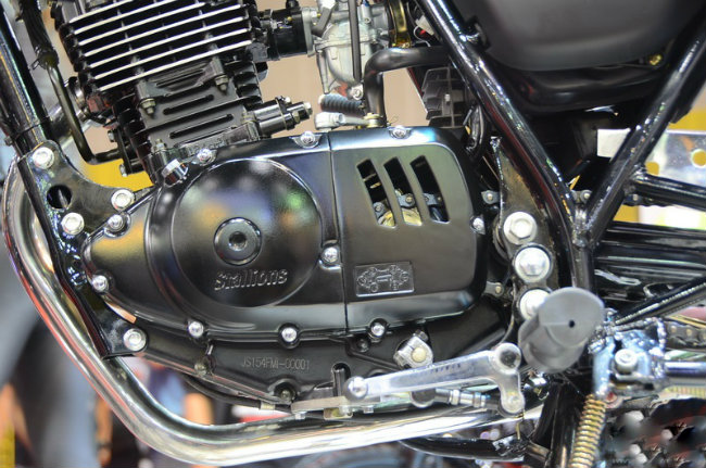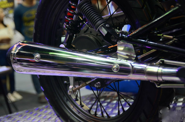 Dung tích bình xăng lớn 13 lít, bộ phành bánh trước cỡ 17-inch đi kèm với loại lốp 90/90 và phía sau có lốp cỡ 110/80. Trọng lượng xe nhẹ chỉ 120 kg. Cận cảnh phanh đĩa, lốp và hệ thống treo sau của xe.