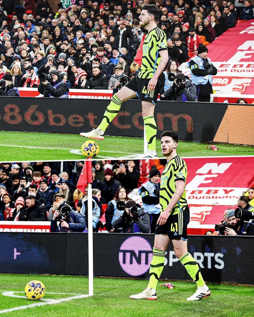 Đã trở thành hình ảnh quen thuộc tại các trận đấu của Arsenal: Declan Rice cẩn thận đặt bóng cạnh cột cờ góc, lùi lại ba bước, rồi tung ra quả tạt với quỹ đạo xoáy và độ chính xác hoàn hảo.