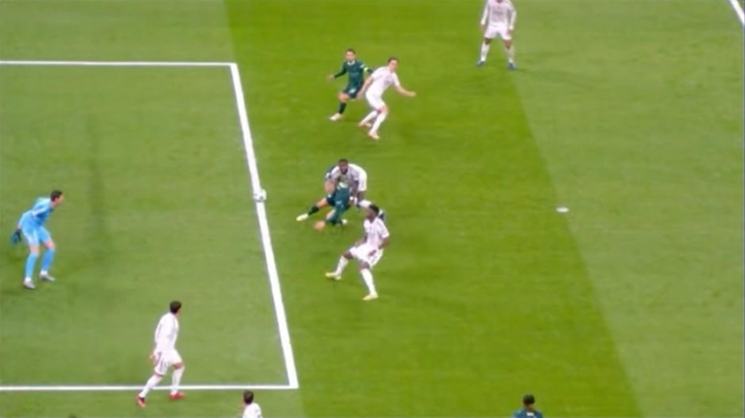 Phút 42, trong một pha xâm nhập vòng cấm của Man City, Haaland bị trung vệ Antonio Rüdiger tác động từ phía sau. Tình huống diễn ra nhanh nhưng đủ khiến các cầu thủ áo xanh phản ứng dữ dội, cho rằng tiền đạo người Na Uy đã bị kéo ngã rõ ràng. Trọng tài chính ngay lập tức nhận tín hiệu từ VAR và ra đường biên để xem lại băng hình. Sau gần một phút kiểm tra, ông đưa ra quyết định thổi phạt đền cho Man City, trong tiếng la ó của toàn bộ khán đài Bernabeu.