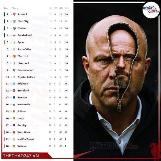Sau 2 trận thắng, Liverpool trở về mặt đất khi tiếp tục thua Man City với tỷ số 0-3 tại vòng 11 Premier League 2025/26. Kết quả này kéo đoàn quân của HLV Arne Slot xuống vị trí thứ 8, cách vị trí top 1 của Arsenal đến 8 điểm.