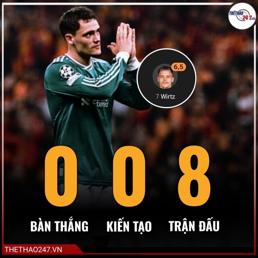 Thực tế, phong độ đáng thất vọng của Wirtz không phải mới xuất hiện trong trận gặp Galatasaray. Kể từ đầu mùa, anh đã ra sân 8 trận chính thức cho Liverpool ở Premier League và Champions League mà không có bất kỳ bàn thắng hay kiến tạo nào. Sự thật càng đáng buồn hơn khi đóng góp duy nhất của Wirtz chỉ đến từ một pha kiến tạo ở trận Community Shield. Nếu loại trừ trận đấu ấy, tiền vệ từng được ca ngợi là “thần đồng bóng đá Đức” đang có chuỗi trận hoàn toàn tịt ngòi về mặt thống kê.