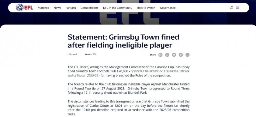 Grimsby tạo nên địa chấn khi cầm hòa 2-2 trong 90 phút và loại MU trên chấm 11m với tỷ số 12-11. Tuy nhiên, EFL xác định Grimsby đã đăng ký Clarke Oduor trễ 1 phút so với hạn chót (12h01 thay vì 12h00). Đội bóng hạng 4 bị phạt 20.000 Bảng, trong đó 10.000 Bảng treo đến hết mùa 2025/26.