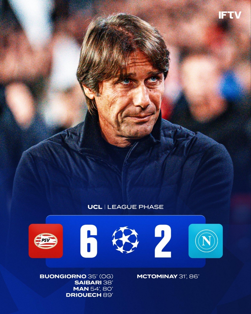 Sau thất bại 2-6 trước PSV ở Champions League, HLV Antonio Conte đã thẳng thắn nhìn nhận vấn đề nội tại của Napoli. Đội bóng miền Nam nước Ý hiện chỉ có 3 điểm sau 3 trận và đang gặp khó trong cuộc đua giành vé đi tiếp. Ở Serie A, Napoli đứng thứ ba với 1 điểm ít hơn AC Milan, song đằng sau thành tích ấy là hàng loạt dấu hỏi về sự ổn định của nhà đương kim vô địch.