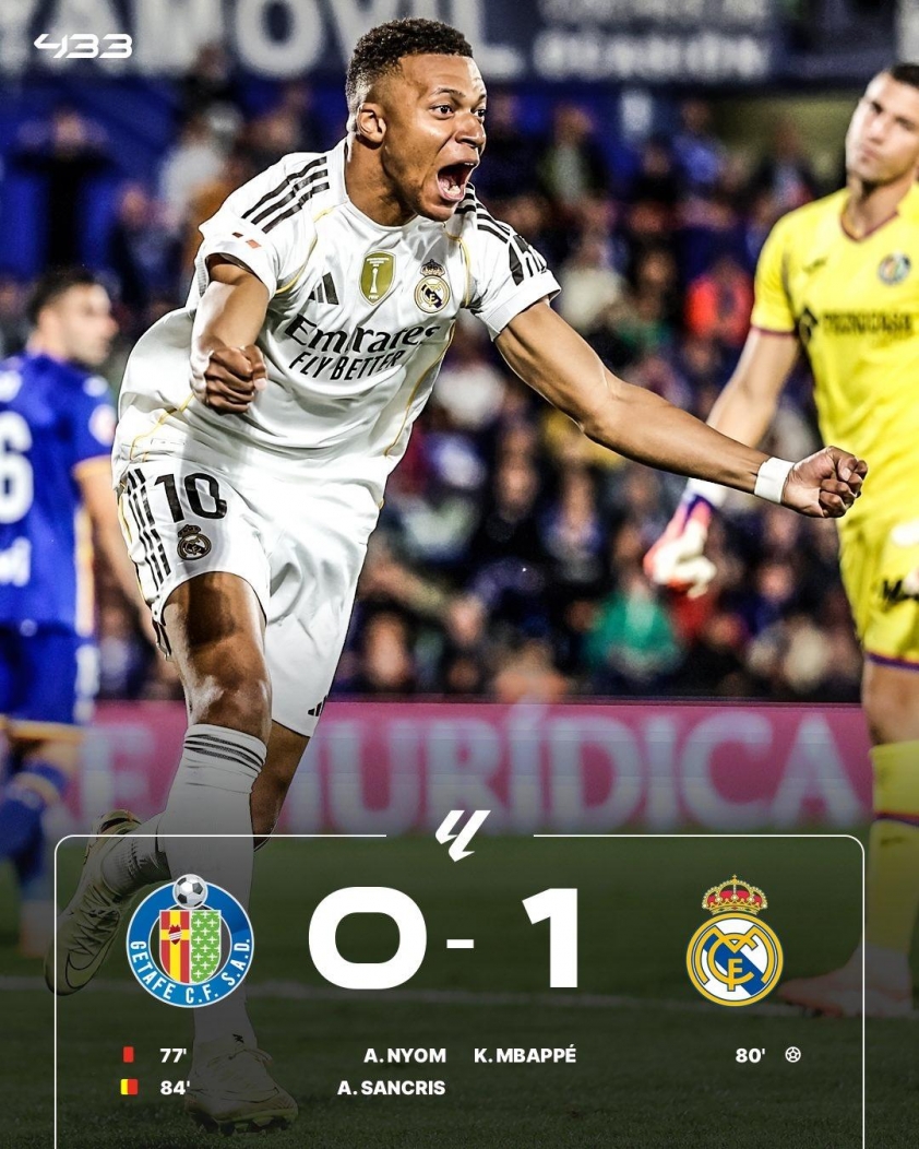 Trên sân Coliseum, Real Madrid gặp rất nhiều khó khăn trước hàng thủ kín kẽ của đội chủ nhà. Sau khi vào sân từ hiệp hai, Vinicius mang lại tốc độ và năng lượng cho hàng công, nhưng cũng là tâm điểm của va chạm. Chỉ ít phút sau khi Allan Nyom vào sân, cầu thủ này đã phải nhận thẻ đỏ vì phạm lỗi với Vinicius. Tận dụng lợi thế hơn người, Mbappe nhanh chóng ghi bàn từ đường kiến tạo của Arda Guler, ấn định chiến thắng tối thiểu cho Real Madrid. Cuối trận, Alex Sancris của Getafe cũng bị truất quyền thi đấu sau pha phạm lỗi với Vinicius, khiến đội chủ nhà chỉ còn chín người.