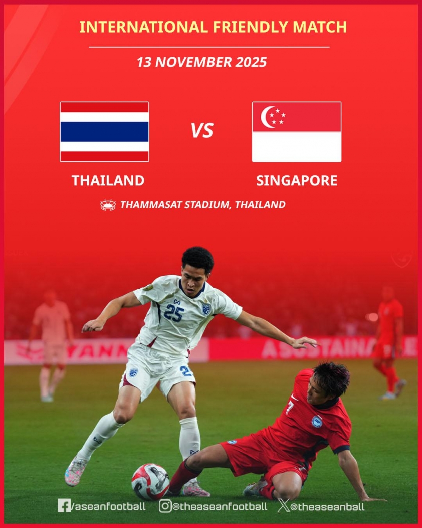 Thái Lan sẽ đối đầu Singapore trong trận giao hữu diễn ra ngày 13/11 trên sân Thammasat, được xem là bước chạy đà quan trọng cho vòng loại Asian Cup 2027.