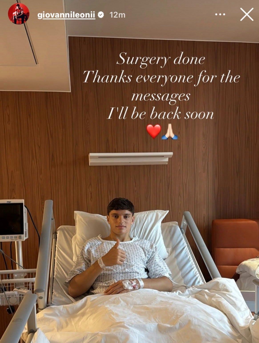 Trên trang cá nhân, Leoni cũng xác nhận anh đã trải qua ca phẫu thuật thành công. Trong hình ảnh chụp tại giường bệnh, cầu thủ 18 tuổi gửi thông điệp ngắn gọn: “Ca phẫu thuật đã xong. Cảm ơn mọi người vì những lời nhắn gửi. Tôi sẽ sớm trở lại”, kèm biểu tượng trái tim đỏ và hai bàn tay cầu nguyện.