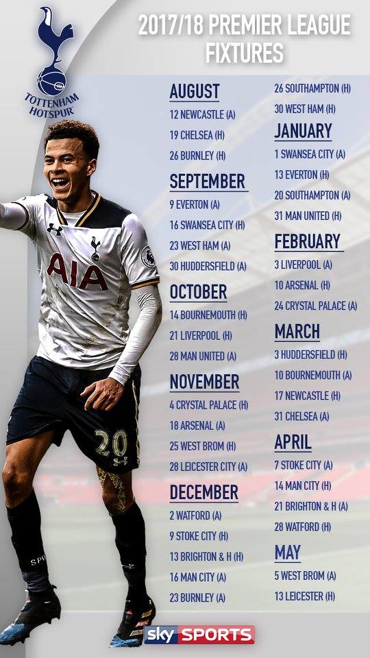Trận đấu đầu tiên của Spurs tại Ngoại hạng Anh là trận làm khác trên sân St James Park của Newcastle. Ngay sau đó sẽ là trận derby rực lửa với Chelsea tại vòng đấu thứ 2. Dựa trên lịch thi đấu, giai đoạn đầu tháng 2 sẽ là giai đoạn khó khăn của Tottenham Spur khi họ phải đối đầu với cả Man United, Arsenal và Liverpool. Mục tiêu của HLV Pocchettino đặt ra vẫn sẽ là một chân trong Top 4 nhằm có suất tham dự Champions League.