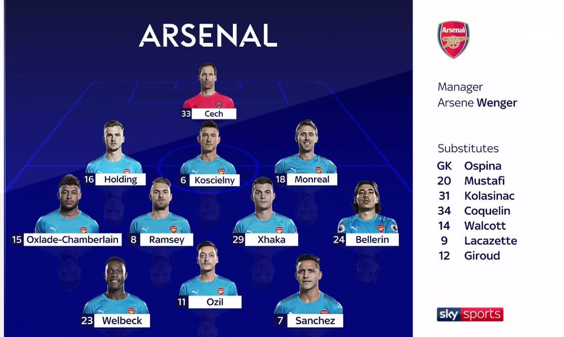 ARSENAL: Cech, Holding, Monreal, Koscielny, Oxlade-Chamberlain, Xhaka, Bellerin, Ramsey, Sanchez, Ozil, Welbeck.