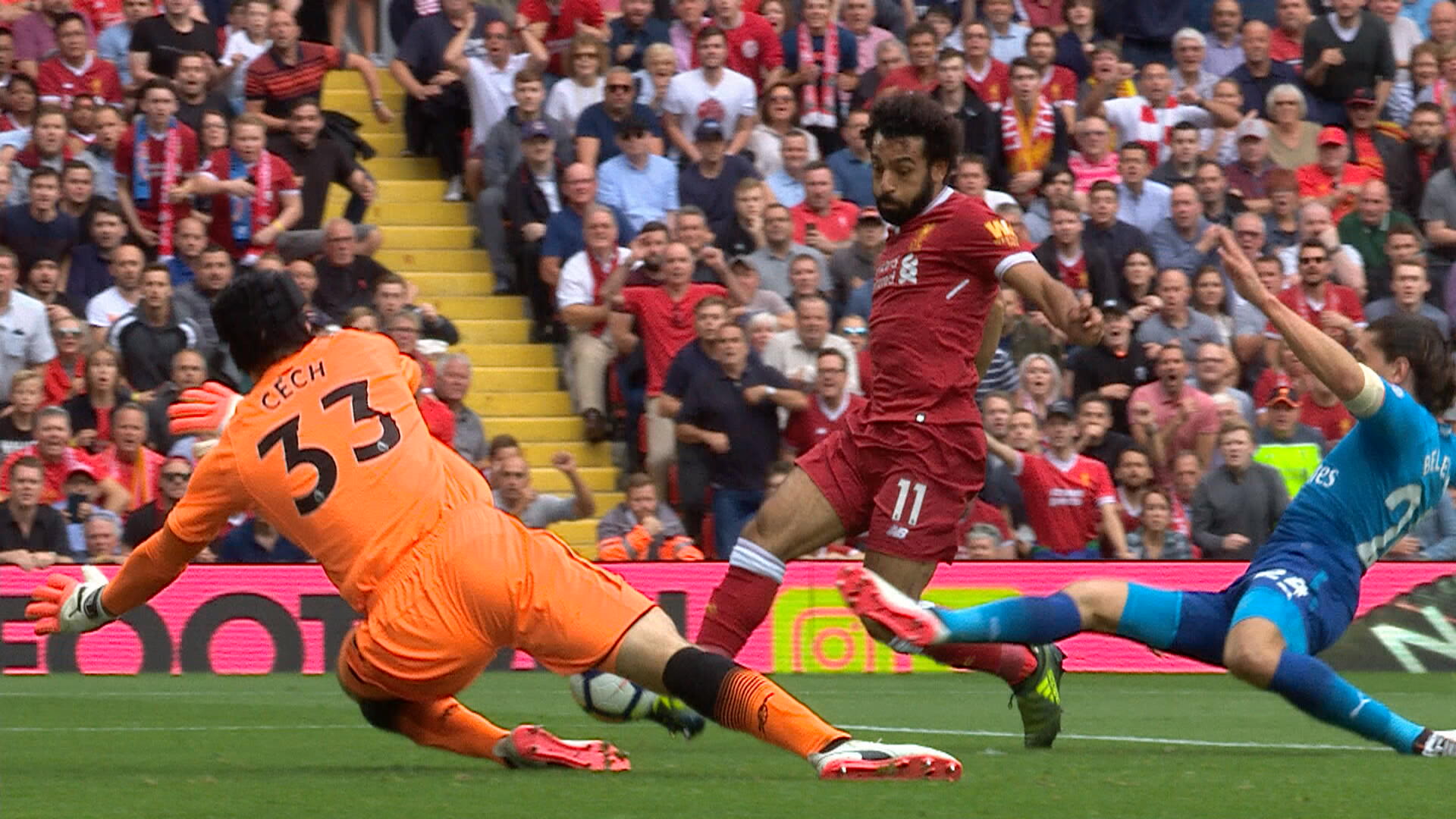 Trước trận đấu hấp dẫn nhất vòng 3 Ngoại hạng Anh, cả Arsenal và Liverpool đều nhắm đến 3 điểm. Arsenal có lợi thế về mặt lực lượng khi tiền đạo trụ cột Sanchez trở lại, trong khi Liverpool lại không có sự phục vụ của Coutinho. Tuy nhiên với việc thi đấu ở sân nhà Liverpool đã tràn lên tấn công ngay từ đầu. Đội chủ nhà kiểm soát bóng phần lớn thời gian đầu trận và liên tục tạo ra những cơ hội ngon ăn. Từ đường chuyền của Gomez bên cánh phải, Firmino đã bật cao đánh đầu mở tỷ số của trận đấu ở phút 20.