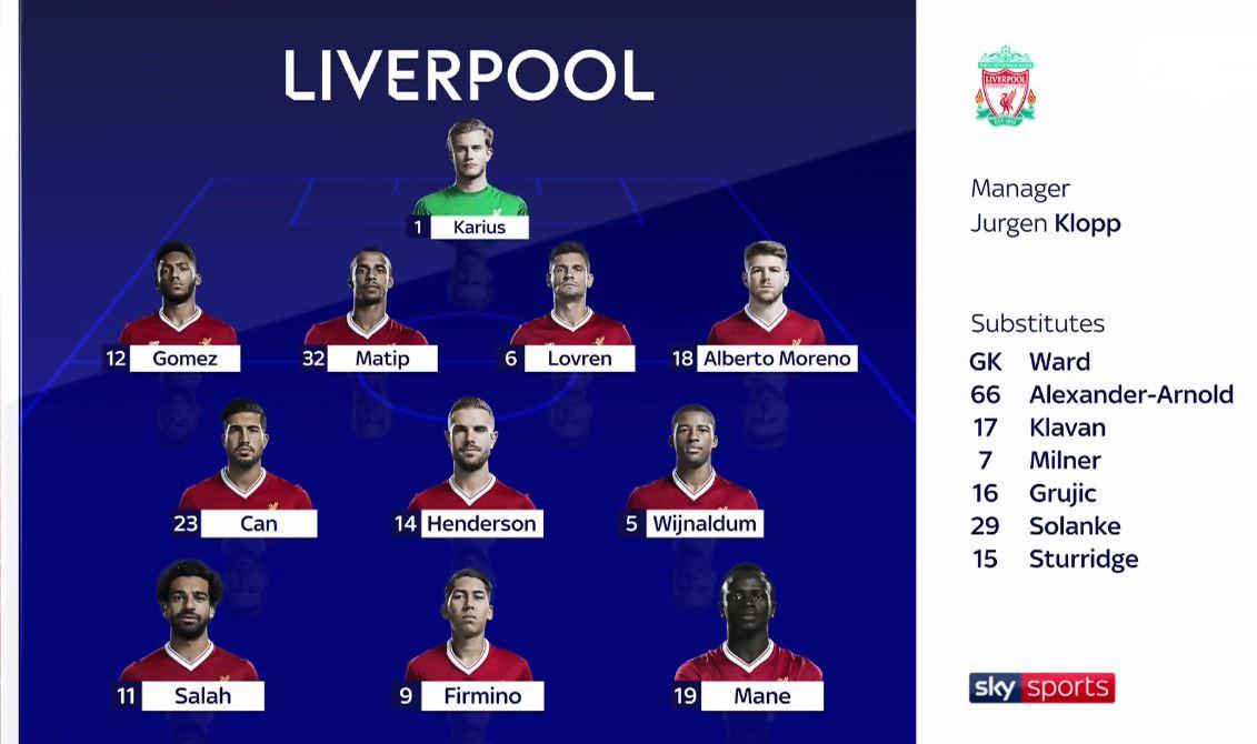 LIVERPOOL: Karius, Gomez, Matip, Lovren, Moreno, Henderson, Can, Wijnaldum, Mane, Salah, Firmino.