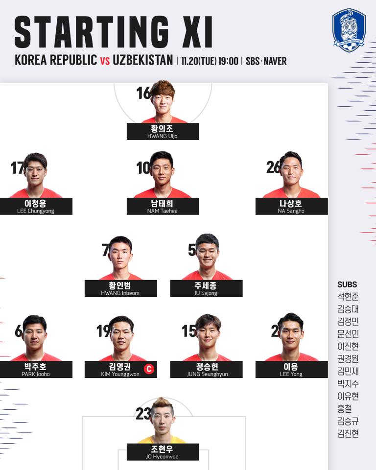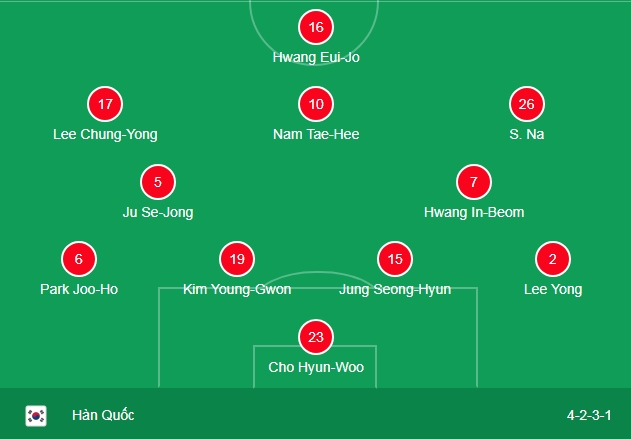 Hàn Quốc: Jo Hyeon Woo, Park Joo Ha, Kim Yong-gwon, Jung Seung Huyn, Lee Yong, Hwang In-beom, Ju Sejong, Lee Chung-yong, Na Sang-ho, Nam Tae-heui, Hwang Ui-jo.