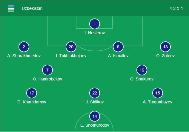 Uzbekistan: Nesterov - Shorakhmedov, Tukhtakhujaev, Ismailov, Zoteev - Hamrobekov, Shukurov - Khamdamov, Sidikov, Turgunbayev - Shomurodov.