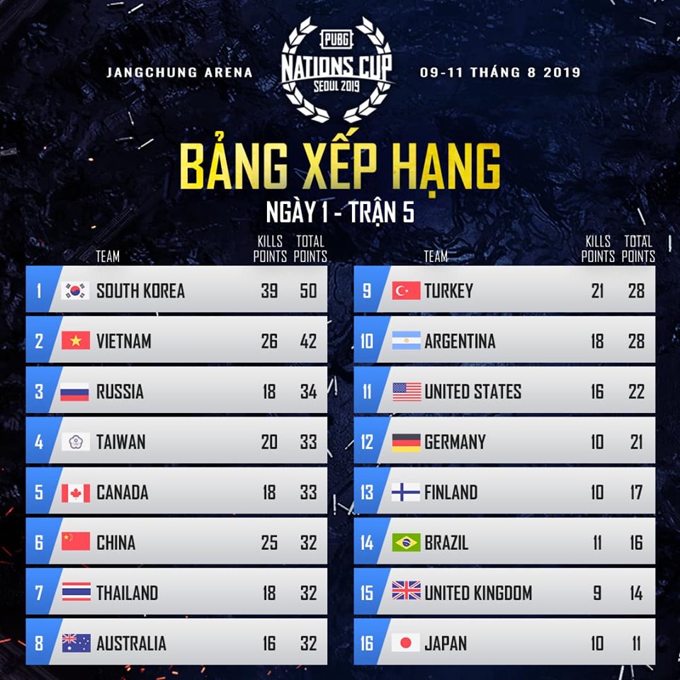Kết quả PUBG Nations Cup 2019 ngày 9/8:
