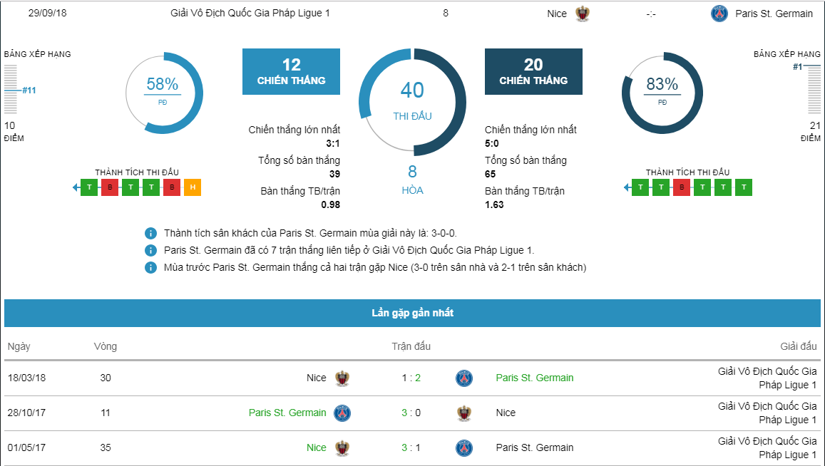 Với Nice thì trận đấu trên sân nhà ở vòng đấu này rõ ràng là nhiệm vụ khó khăn. P. Vieira cùng các học trò đã lấy lại được sự ổn định thế nhưng điều đó vẫn chưa đủ để họ tìm tiếng nói trước PSG. Vị trí thứ 11 trên BXH với 10 điểm nghĩa là đội bóng này hiện đang kém đội khách tới 11 điểm tương đương với 10 bậc.