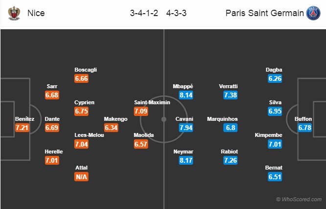 Bên kia chiến tuyến, Nice đang cho thấy sự tiến bộ khi họ thắng 3/4 vòng đấu gần nhất tại Ligue 1. Trước đó, Nice đã trải qua 3 vòng đấu đầu tiên chỉ kiếm được 1 điểm. Có thể thấy rõ, mọi chuyện đang dần được cải thiện dưới triều đại của HLV Patrick Viera. Tuy nhiên, chừng đó là chưa đủ giúp họ có thể giành lợi thế trước ông lớn PSG ở cuộc thư hùng đêm nay.