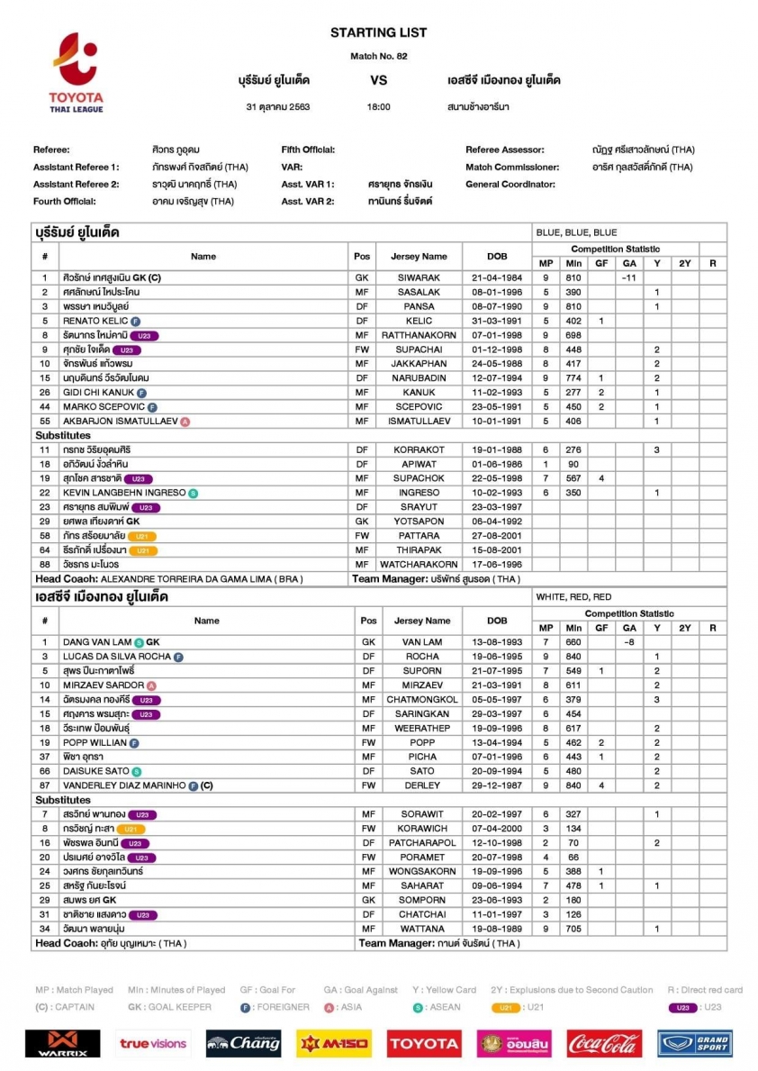 -Buriram: Siwarak, Renato, Ingreso, Suphanat, Narubadin, Apiwat, Korrakot, Pansa, Jakkaphan, Akbar, Gidi, Marko, Supachai