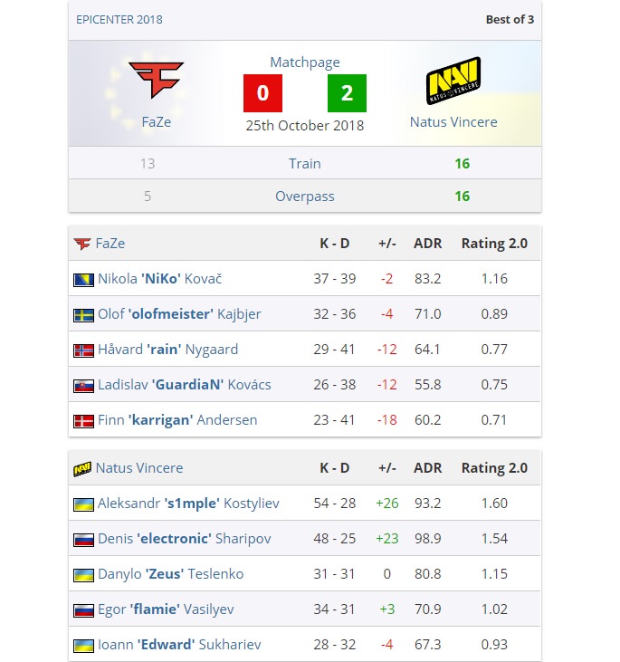 Overpass chính là map pick của FaZe Clan nhưng có lẽ thất bại đáng tiếc ở map 1 đã khiến họ bị vấn đề tâm lý khi tất cả các player đều thi đấu mờ nhạt và không có sự liên kết với nhau. Na`vi dễ dàng vượt qua FaZe với tỷ số 16-4, qua đó chính thức vào vòng bán kết, còn FaZe Clan sẽ phải đối đầu với NiP ở vòng tứ kết để tìm ra người vào bán kết.