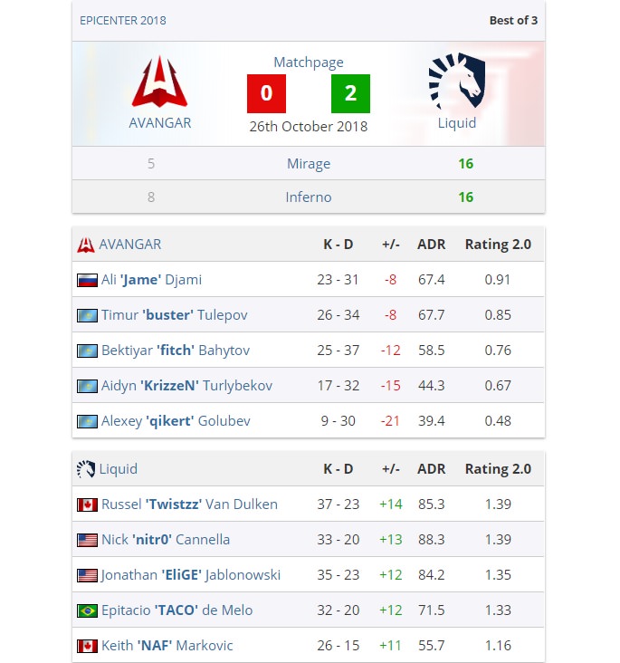 Không có bất ngờ khi “siêu xayda” cùng đồng bọn nhanh chóng đè bẹp AVANGAR trong một trận thi đấu mà họ outskill và out-aim hoàn toàn đối thủ của mình. Map 1 kết thúc với tỷ số 16-5 và map 2 là 16-8 cho Liquid.