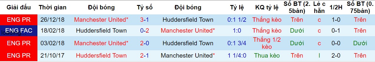 Trong tổng cộng 4 lần gặp nhau trước đây, Huddersfield thắng kèo 1 trận, MU thắng kèo 3 trận.