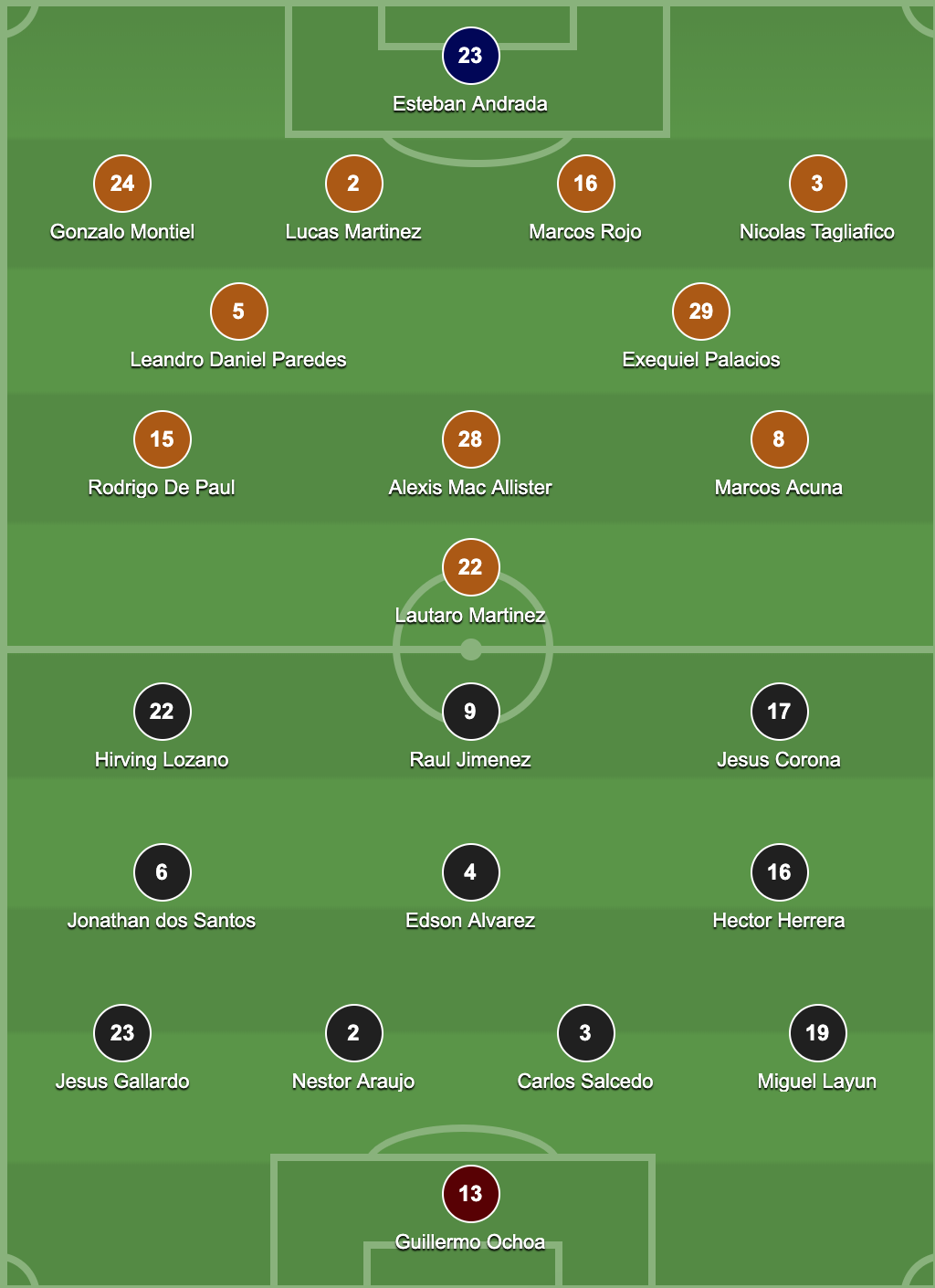 L.Martinez là cái tên đã thi đấu nổi bật trong đội hình tuyển Argentina. Chỉ trong 5 phút thi đấu từ 17 đến 22, L.Martinez liên tiếp tỏa sáng, qua đó đưa đội nhà vươn lên dẫn trước 2-0. Có được lợi thế lớn, các tuyển thủ Argentina chơi tự tin hơn với những đợt tấn công liên tiếp. Trước sức ép từ đối thủ, phút 33 Mexico phải chịu phạt đền khi một cầu thủ để chạm tay trong vòng cấm địa. Đứng trước quả 11m, Leandro Paredes không bỏ qua cơ hội đưa Argentina vươn lên dẫn 3-0.