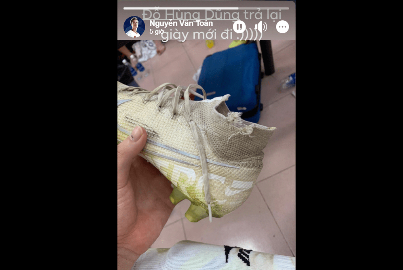 Mới đây, Văn Toàn đã đăng một bức ảnh chụp đôi giày rách của mình kèm trạng thái: "Đỗ Hùng Dũng, trả lại giày mới đi".