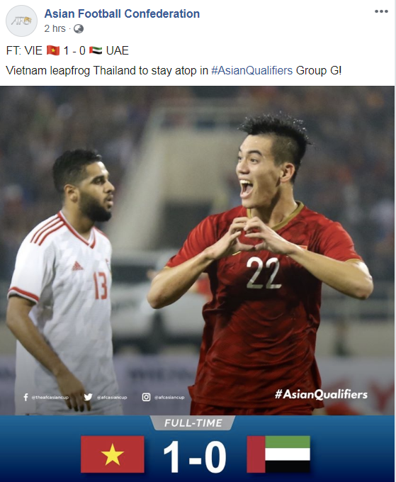 Ngay sau chiến thắng 1-0 của ĐT Việt Nam trước UAE, trang fanpage của AFC đã đăng dòng trạng thái để chúc mừng thành tích của ĐT Việt Nam: 'Việt Nam vượt qua Thái Lan để đứng đầu tại bảng G'.