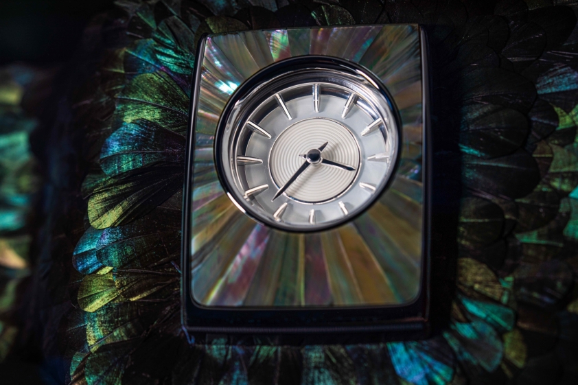 Chi tiết độc đáo này được trang trí xung quanh đồng hồ - trang bị được thiết kế vốn dĩ đã rất tinh xảo với những khảm ngọc trai xung quanh.