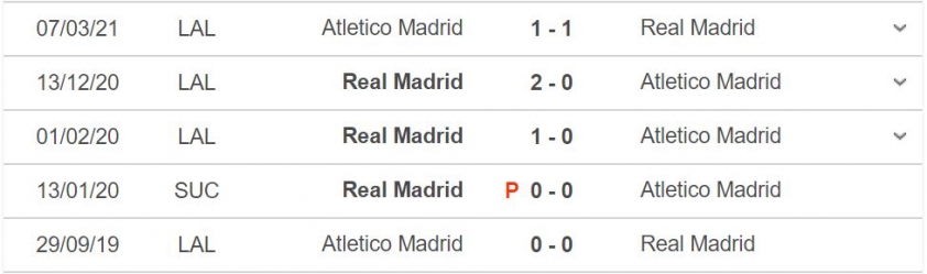 - Lần gần nhất Real Madrid phải nhận thất bại trước Atletico đã là từ năm 2019