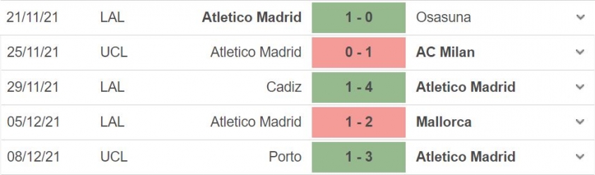 - Atletico Madrid có được 3 chiến thắng, 2 thất bại trong 5 trận đấu gần nhất