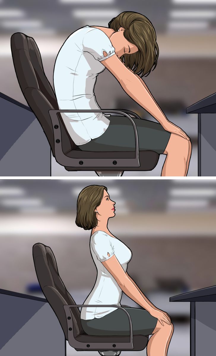 - Ngồi vào bàn làm việc, chú ý đúng tư thế thẳng lưng