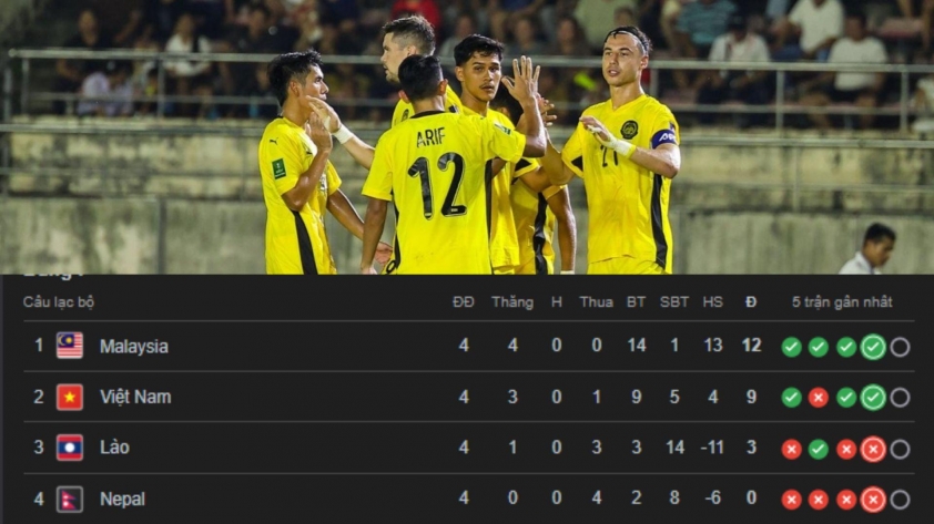 Với 12 điểm tuyệt đối, ĐT Malaysia tạm dẫn đầu bảng F, hơn đội nhì bảng Việt Nam 3 điểm.