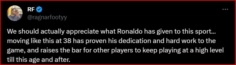 "Chúng ta thực sự nên đánh giá cao những gì Ronaldo đã cống hiến cho môn thể thao này… pha di chuyển ở tốc độ cao như vậy ở tuổi 38 đã chứng tỏ sự cống hiến và làm việc chăm chỉ của anh ấy cho môn thể thao này. Đồng thời nâng cao tiêu chuẩn để các cầu thủ khác tiếp tục chơi ở đẳng cấp cao cho đến tuổi này và xa hơn nữa."