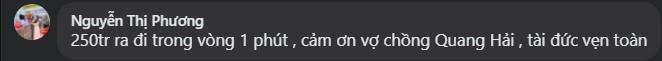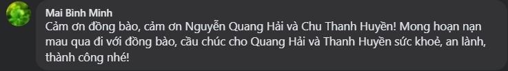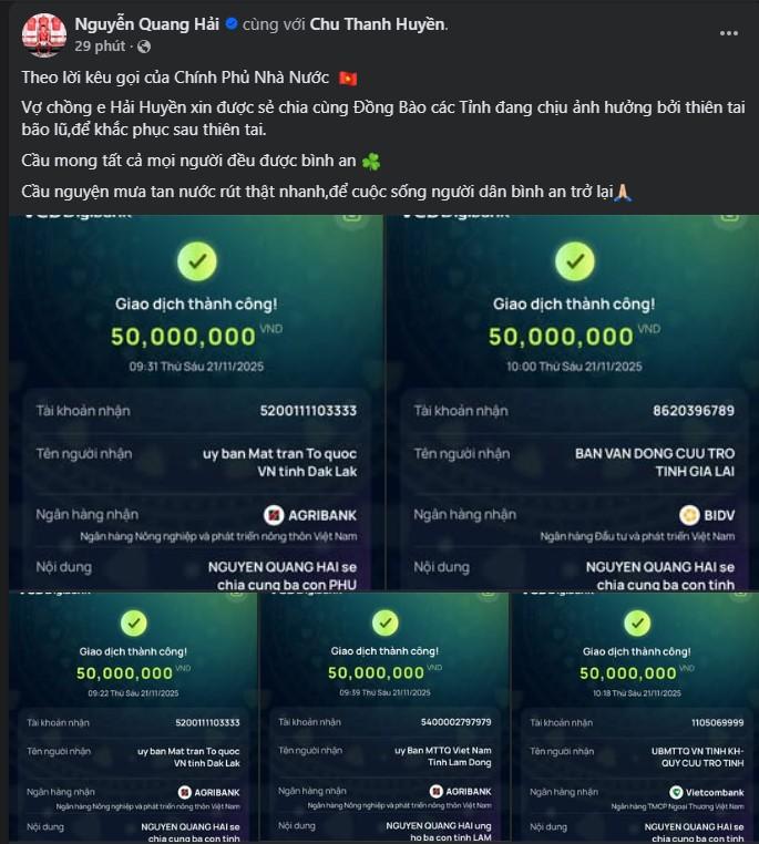 Tiền vệ sinh năm 1997 đăng tải bức ảnh chuyển khoản cùng dòng trạng thái đầy xúc động: "Theo lời kêu gọi của Chính Phủ Nhà Nước. Vợ chồng e Hải Huyền xin được sẻ chia cùng Đồng Bào các Tỉnh đang chịu ảnh hưởng bởi thiên tai bão lũ,để khắc phục sau thiên tai. Cầu mong tất cả mọi người đều được bình an. Cầu nguyện mưa tan nước rút thật nhanh, để cuộc sống người dân bình an trở lại."