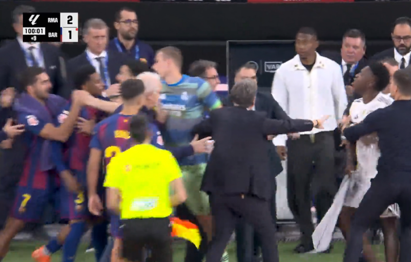Sau màn rượt đuổi kịch tính tại Bernabeu, các ngôi sao của hai đội còn cho thấy sức nóng ngay cả khi trận đấu đã kết thúc. Cụ thể, trong tình huống Pedri nhận thẻ vàng thứ hai và bị truất quyền thi đấu ở phút bù giờ cuối cùng, Vinicius, cầu thủ đã được thay ra từ trước, dường như đã cùng với thủ thành Andriy Lunin có những va chạm với đội ngũ huấn luyện của Barca, qua đó tạo ra màn xô xát giữa hai bên.
