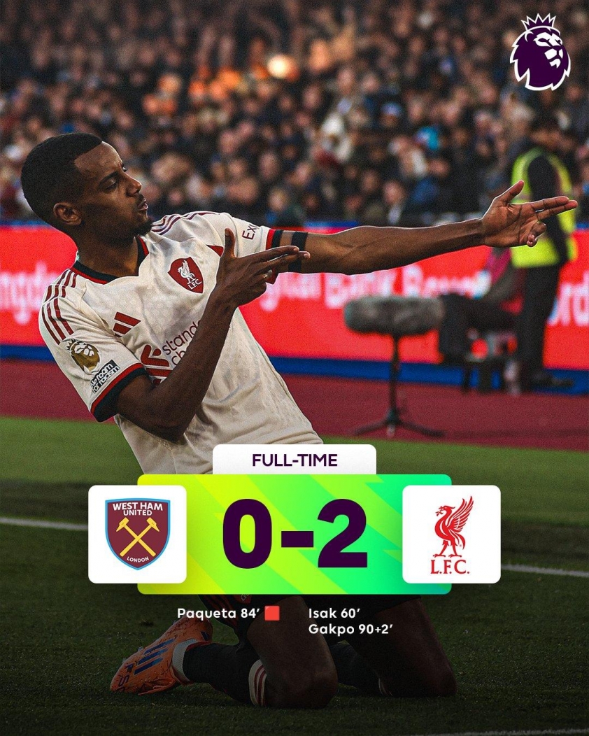 Trong khi đó, đại kình địch Liverpool cũng gặp bế tắc trên sân West Ham. Phải sang đến hiệp hai, The Kop mới lấy lại thế trận và có được bàn khai thông thế bế tắc do công của tân binh Alexander Isak. Đáng nói, đây mới chỉ là bàn thắng đầu tiên của tiền đạo người Thụy Điển tại Ngoại hạng Anh trong màu áo Liverpool.