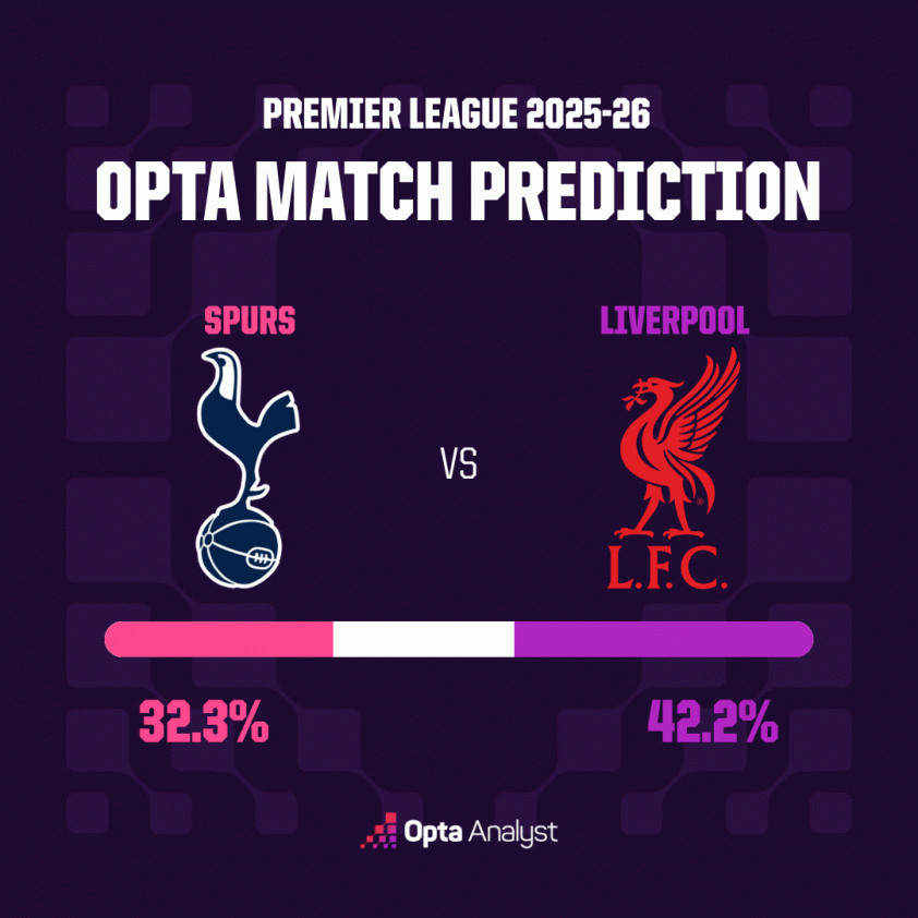 Dù được thi đấu trên sân, Tottenham lại bất ngờ là đội bị đánh giá thấp hơn so với đại diện đến từ Merseyside. Cụ thể, theo dự đoán từ siêu máy tính Opta, Liverpool được đánh giá có 42,3% cơ hội giành trọn 3 điểm. Tỷ lệ này cao hơn khoảng 10% so với khả năng chiến thắng của Tottenham, chỉ dừng ở mức 32,3%, trong khi kịch bản hai đội cầm hòa nhau chiếm 25,4%.