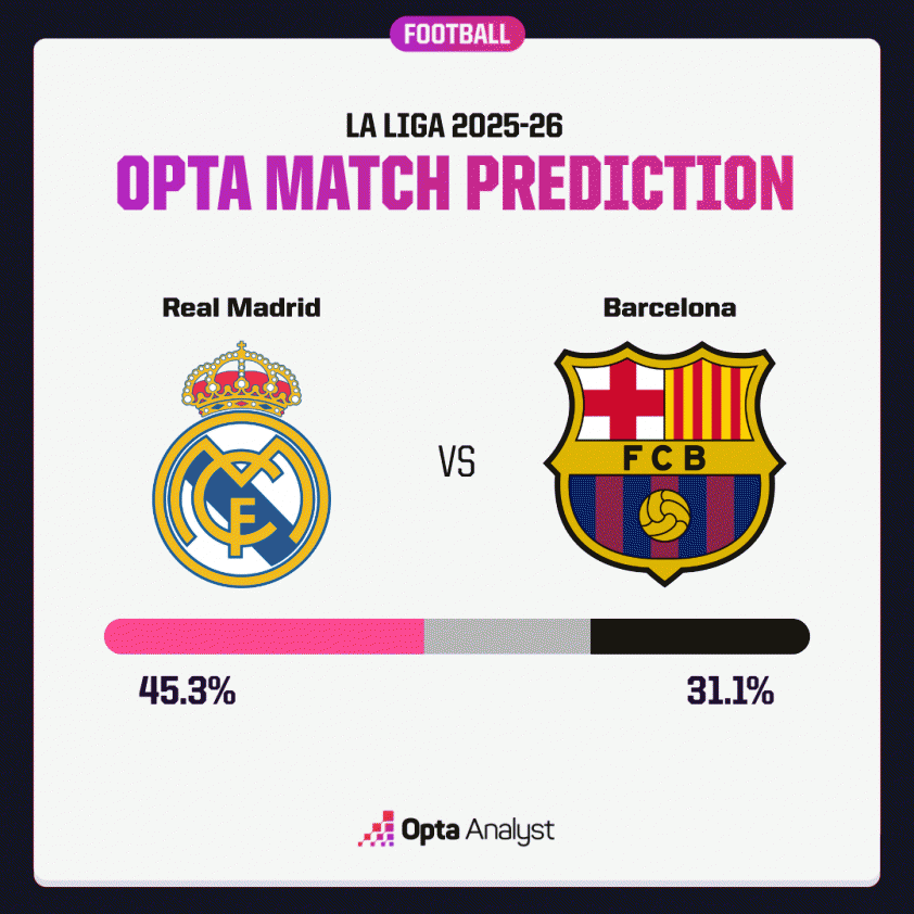 Với điểm tựa sân nhà cùng sự cổ vũ cuồng nhiệt của hàng vạn NHM, Real Madrid phần nào là đội được đánh giá cao hơn so với đại diện đến từ Catalan. Điều này đã được siêu máy tính Opta xác nhận thông qua dự đoán sau 10.000 lần mô phỏng kết quả.