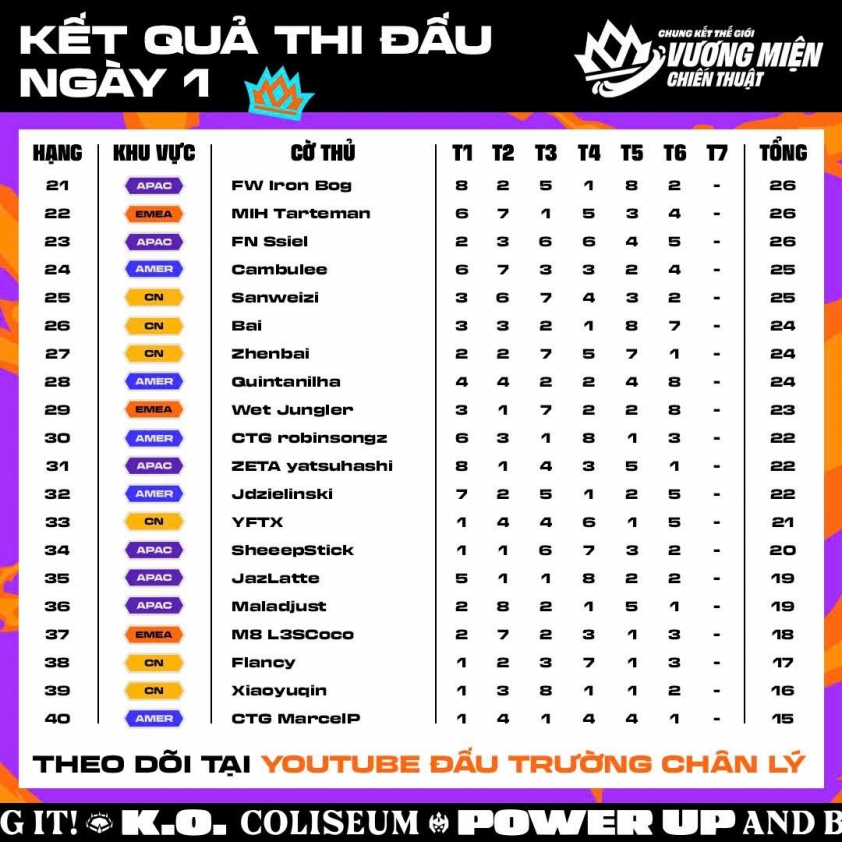 Cập nhật thứ hạng của các tuyển thủ tại Chung Kết Thế Giới Đấu Trường Chân Lý Mùa 15 - K.O. Coliseum Tactician's Crown.