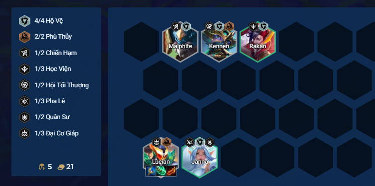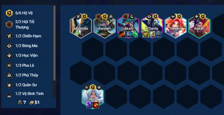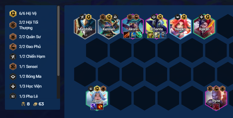 Đội hình này tập trung vào việc buff lá chắn cho Akali để cô nàng sát thủ sống càng lâu càng tốt, tăng tiến sức mạnh với Trượng Thiên Thần và Cuồng Đao, sau đó kéo late để một mình cân tất.
