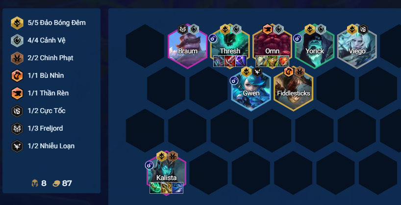Có nhiều đội hình reroll Đảo Bóng Đêm khá mạnh như Gwen hay Viego. Tuy nhiên, trong bài viết này, chúng tôi sẽ chỉ tập trung vào đội hình Fast 8 cơ bản dễ chơi nhất là Đảo Bóng Đêm - Cảnh Vệ với chủ lực Kalista và Thresh. Sát thương cao, phòng thủ trâu và mạnh về cuối trận.