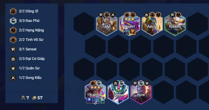 Reroll ở cấp 5 nâng Kalista lên 3 sao. Aatrox 3 sao hoặc Naafiri 3 sao có thể dùng làm tanker chính. Tất nhiên, nếu Kobuko cống hiến và nâng lên được 3 sao thì chẳng tội gì mà không dùng luôn tanker mạnh nhất meta này.