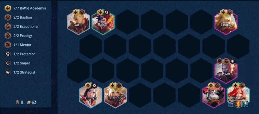 Bắt đầu giao tranh: Các tướng Học Viện đã Thức Tỉnh và đồng minh liền kề với mỗi tướng này nhận 70 Máu, 8% SMCK và 8% SMPT. Các tướng Học Viện nhận gấp đôi. Nhận 1 Katarina.