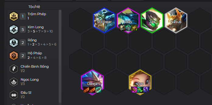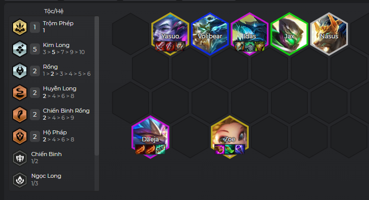 Đội hình Kim Long với 2 Rồng Idas và Daeja khá dễ xây dựng, công thủ toàn diện và có thể farm vàng từ sớm với các trang bị Kim Long hưu ích.
