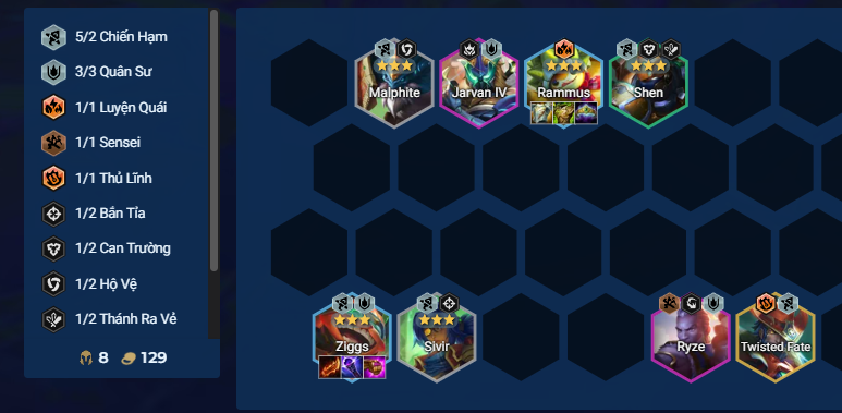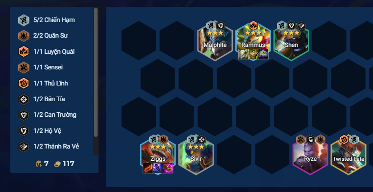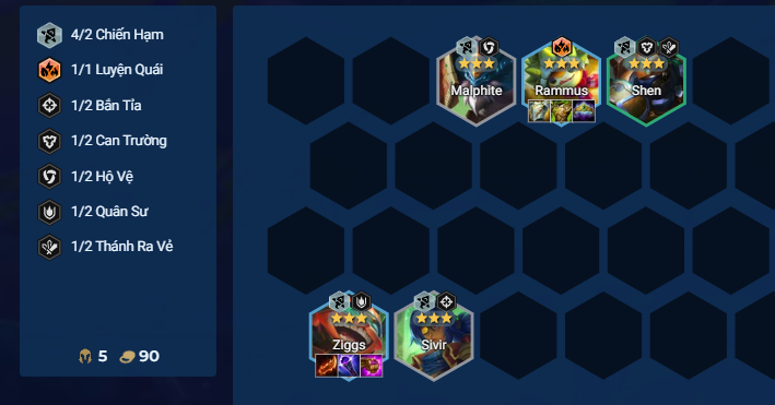 Rammus có thể kết hợp với mọi đội hình reroll 3 tiền và Chiến Hạm cũng không phải ngoại lệ. Đội hình Chiến Hạm kết hợp với Rammus sẽ có hàng tank cực khỏe, tha hồ tạo khoảng trống cho Ziggs và TF xả sát thương.