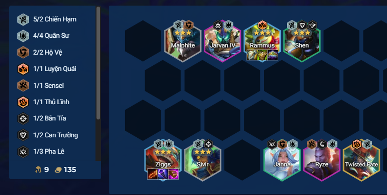 - Đội hình này thường chỉ cần level 8 là đủ bởi phải reroll quá nhiều, nhưng nếu lên được cấp 9 bỏ thêm Janna / Jarvan IV để kích 4 Quân Sư