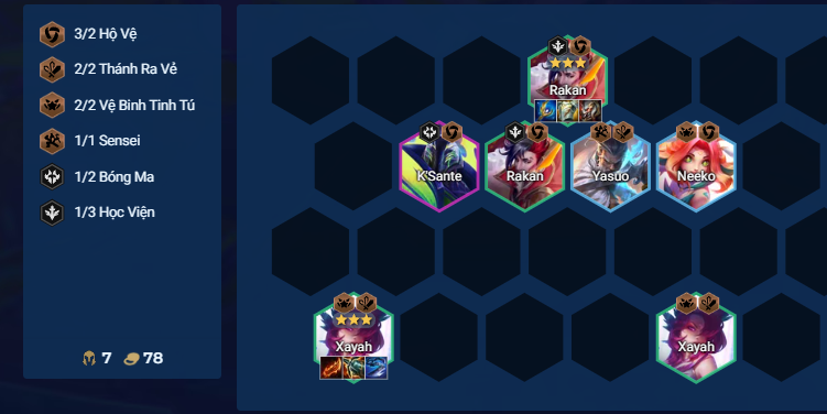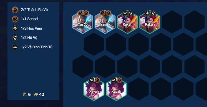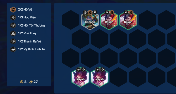 Chỉ chơi khi có lõi công nghệ Cặp Đôi Hoàn Cảnh. Reroll ở cấp 6 nâng Rakan - Xayah lên 3 sao, đi kèm với Hộ Vệ để tank.