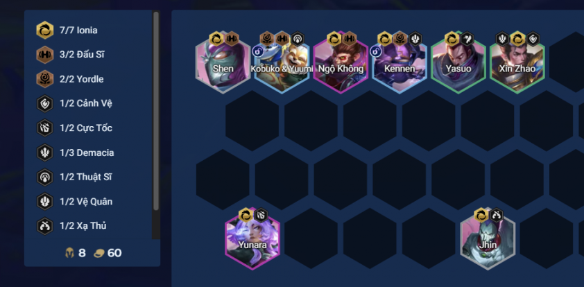 Yunara là tướng có thể kẹp linh hoạt ở cuối trận do chỉ cần kích 2 Cực Tốc là đã rất mạnh. Hai tướng Ionia cuối trận cũng rất mạnh là Ngộ Không và Sett, tạo thành bộ ba vững chắc, từ đó flex thêm các tướng 5 vàng.