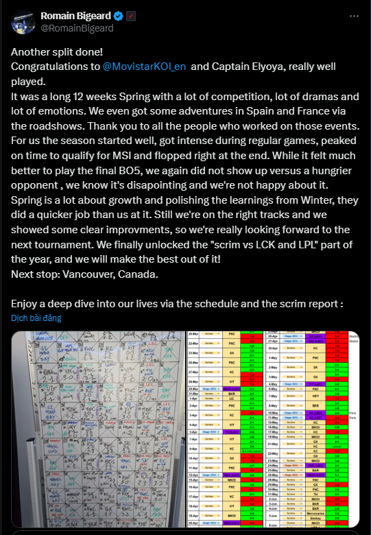 Ngay sau khi LEC Mùa Xuân 2025 khép lại, quản lý của G2 Esports – Romain Bigeard – đã công bố toàn bộ kết quả đấu tập (đấu tập) của đội trong suốt mùa giải. Thông qua bài đăng trên nền tảng X, ông tiếp tục duy trì truyền thống minh bạch thông tin, đồng thời cho cộng đồng thấy rõ cường độ và chất lượng luyện tập của G2 trong hành trình tiến tới trận chung kết.