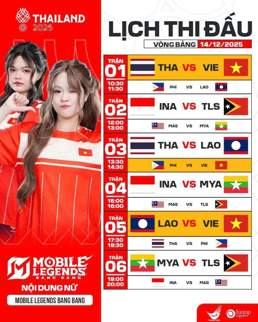 Bộ môn MLBB Nữ sẽ thi đấu ngay từ 10h30 sáng với trận mở màn giữa Việt Nam và Thái Lan. Các cô gái Việt Nam sẽ đánh tổng cộng 3 trận trong ngày, 2 trận còn lại là với Philippines và Lào.