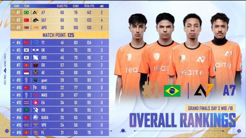 Chức vô địch giải đấu PMGC 2025 thuộc về đội tuyển Alpha7 Esports của Brazil. Đội tuyển này chỉ giành hạng 5 ở Vòng Gauntlet nhưng đã có màn trình diễn vô cùng ấn tượng xuyên suốt 3 ngày thi đấu Vòng Chung Kết.